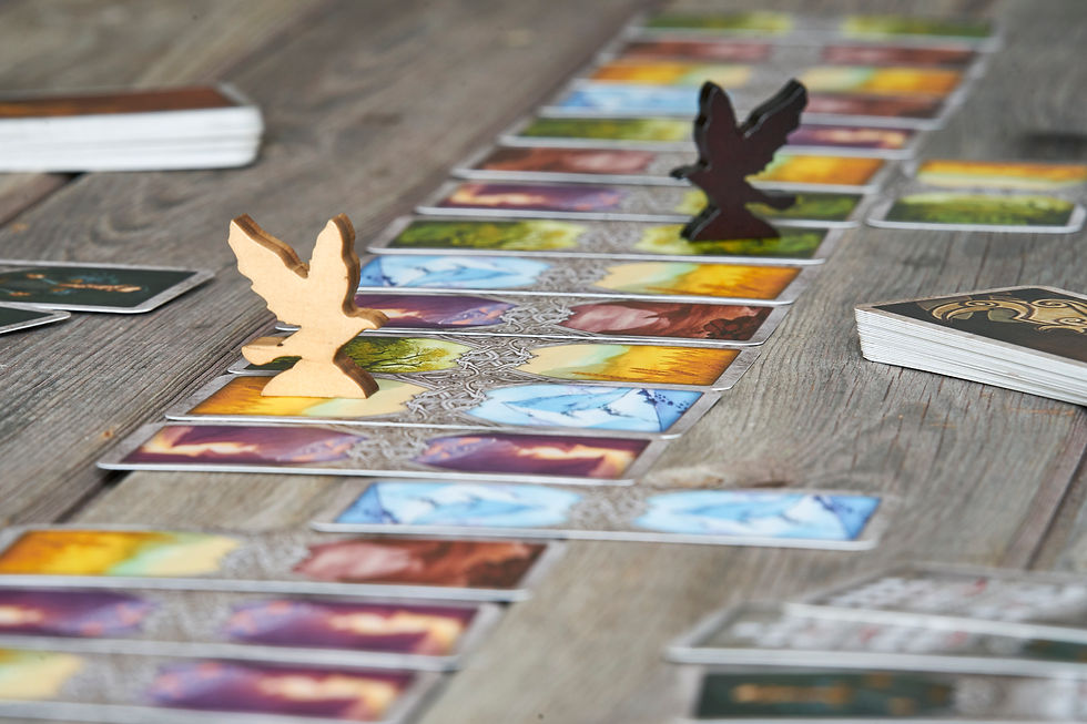You are both playing raven’s, trying to cross the vast landscape of the world – through mountains, deserts, caves and more. The aim is to be the first player to make it from one side to the other. If you have the matching landscape cards in your hand as the next one on your journey, you can fly on through to the next tile. However, Loki has some tricks up his sleeve. You each get a handful of ability cards which can be used to move you further ahead.. or to spite your opponent and make their journey more difficult.